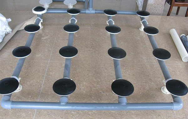 曝氣裝置由,曝氣器、布氣管道、三通、四通、彎頭、調節器、連接件、**裝置等組成。布氣管道按通常的環形布置,微孔曝氣器(按供氣量和池形布置密度,曝氣頭和布氣管道的連接采用G3/4螺紋連接,底座為內螺紋(固定于布氣管道上)曝氣頭為外螺紋,安裝時先把調節器按所需尺寸用膨脹螺栓固定在池底,然后用抱箍把布氣管道固定在調節器上,為防止其它作業如電焊火花和土建時,混凝土等重物損壞曝氣裝置,必須等土建工程結束后在放水前把曝氣頭裝上,為防止管道和連接部分漏氣,應放水超過曝氣頭10cm左右底深度試漏,然后通氣如發現有管道連接部分漏氣應及時排除,然后正式投運。